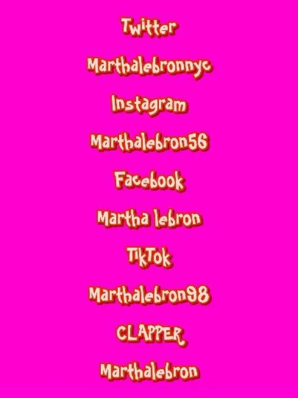 Hello there, Come check out my social media profiles lets get together and have some fun I am planning many new ventures regarding my social media INSTAGRAM: MARTHALEBRON56 FACEBOOK: MARTHA LEBRON TWITTER: MARTHALEBRONNYC TIKTOK: MARTHALEBRON98 CLAPPER: MARTHA LEBRON YOUTUBE: (COMING SOON) Hope to see you all there, the ladies and gentlemen